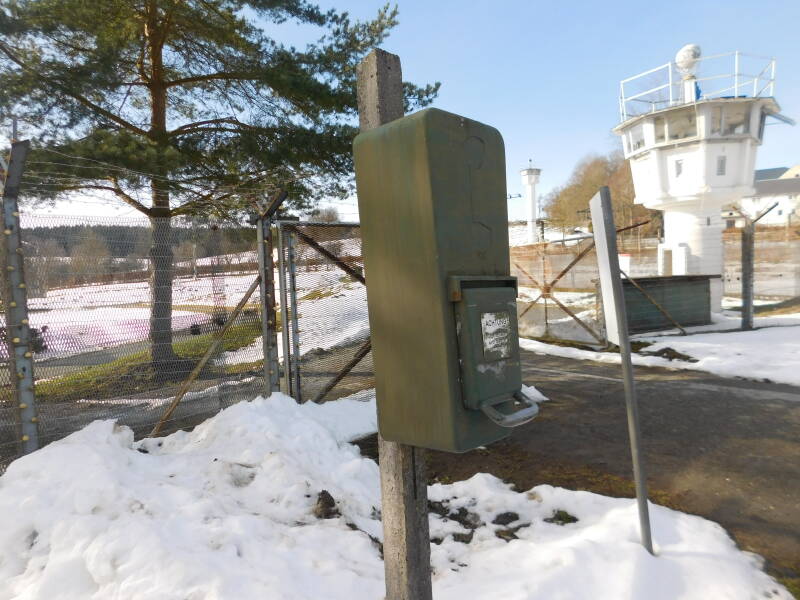 Was es noch gab waren die sogenannten Postensprecheinrichtungen. Diese waren ganz einfach aufgebaut: An einer Betonsäule führte ein Kabel hoch, dass in einem kleinen Schaltkasten endete. Neben dem Schaltkasten war eine kleine Steckdose angebracht.