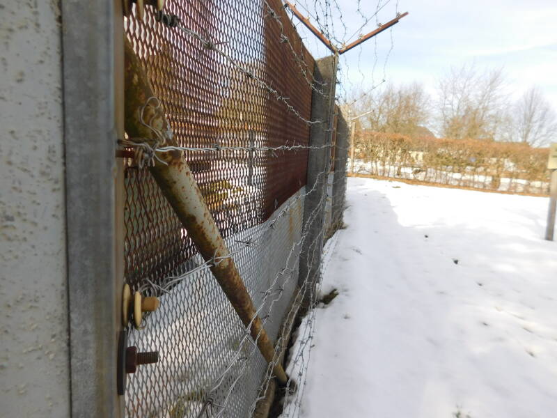Der erste Zaun war etwa 2,5 Meter hoch hatte vorn Stacheldraht und oben Stacheldraht wie ein Y. Ein Hund wog an die 40 Kilo und würde sich sicherlich freuen wenn man ihn packen würde mit ihn ausholte und dann fast 3 Meter hoch durch die Luft schleuderte. Das mir das nicht einfiel.